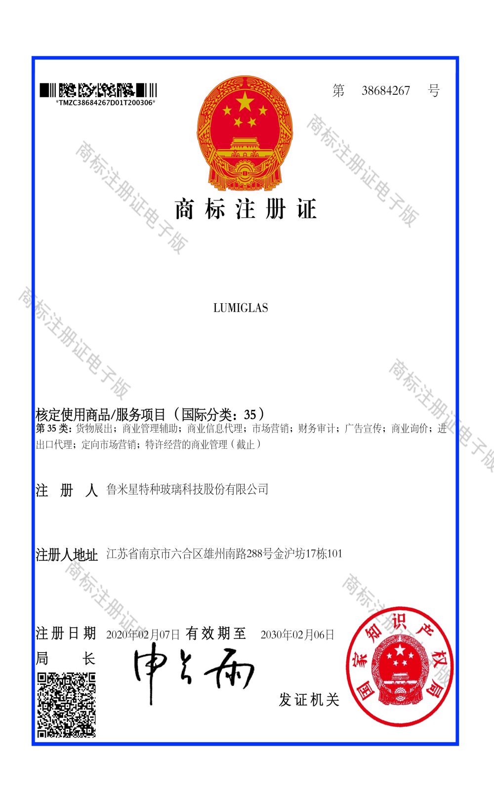 LUMIGLAS 9類 19類 35類商標(biāo)注冊證