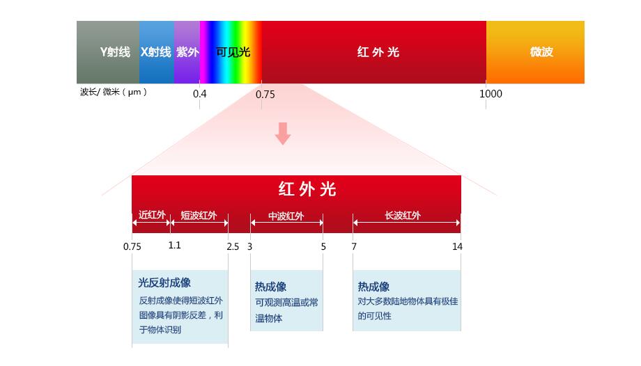 紅外線是波長介乎微波與可見光之間的電磁波,波長為0.75~1000 μm,其中,近紅外、短波紅外、中波紅外、長波紅外所在區間如下: