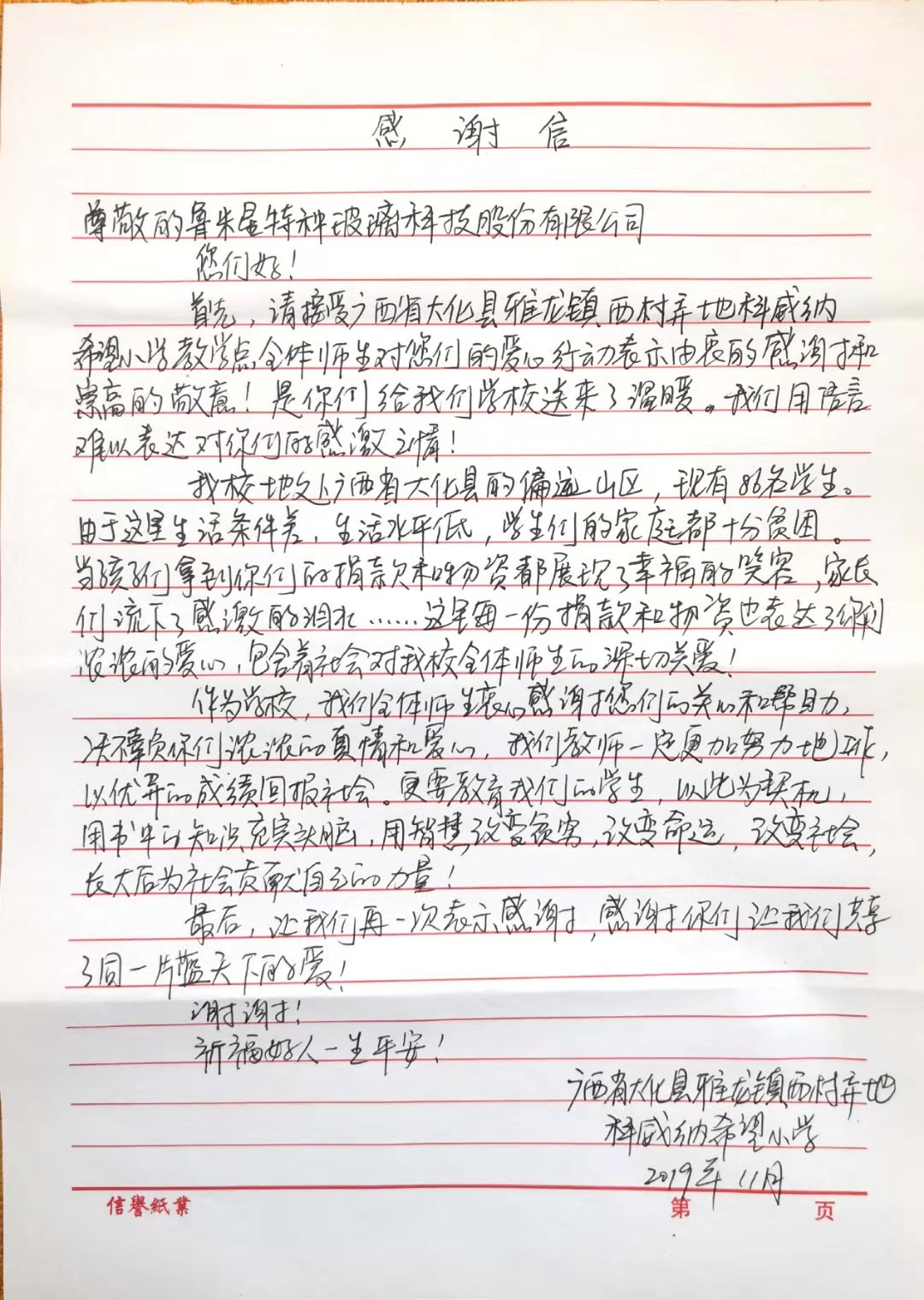 魯米星公司為廣西大化縣雅龍鎮西村弄地科威納希望小學捐資,科威納希望小學發來感謝信表示感謝!
