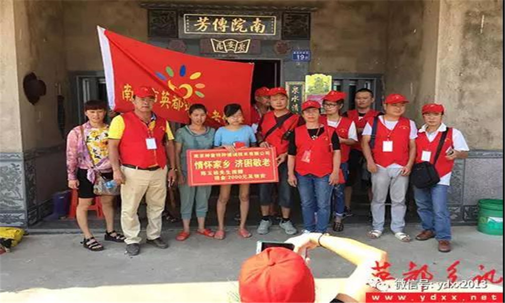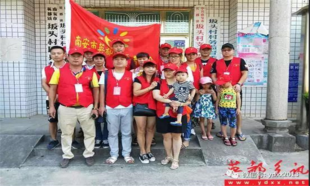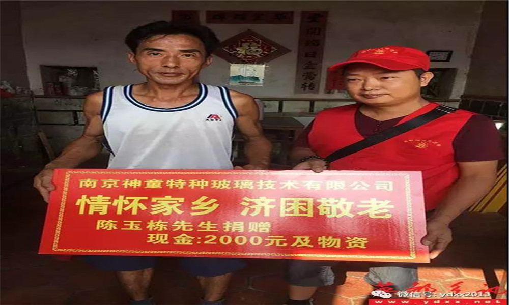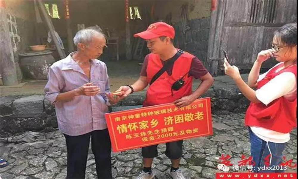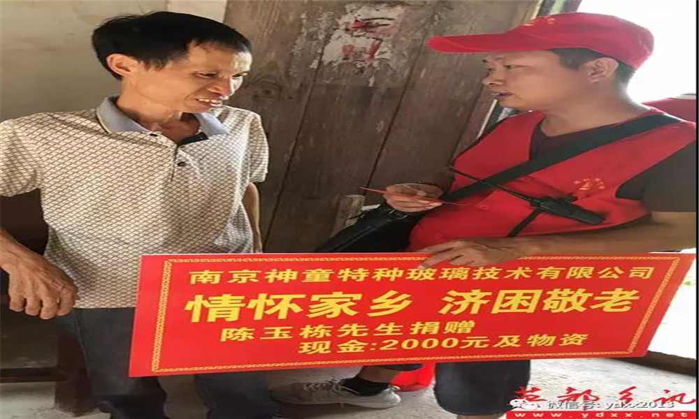 2017年8月的一個偶然機會,坂頭村黨支部書記蔡緒藝和南京神童特種玻璃技術有限公司的陳玉棟先生的一次聊天中透露,村里有5戶特困戶生活特別困難,其中一戶人家的女兒考上了大學,卻無力交學費及上學費用,家長心急如焚。陳玉棟先生聽說后馬上委托英都鎮志愿者協會負責人,用公司的名義冠名贊助,首批贊助為每戶2000元現金和兩袋大米兩桶花生油,英都鎮志愿者協會接到委托后迅速組織志愿者,聯系了坂頭村相關領導,村委支部委員卓滿治趕來帶路支援,崎嶇的山路,炎炎的夏日,帶上陳玉棟先生的殷殷祝福,志愿者們行走在鄉間小道上一家家登門慰問.