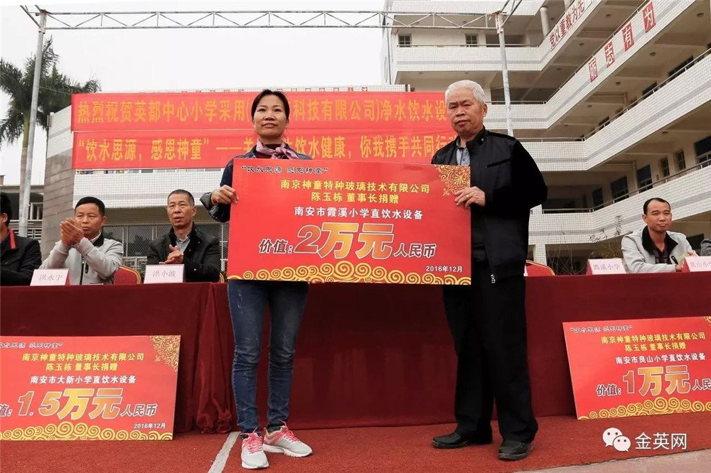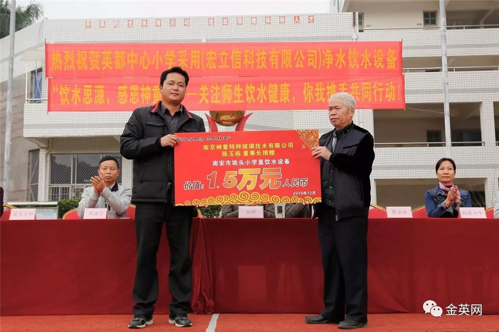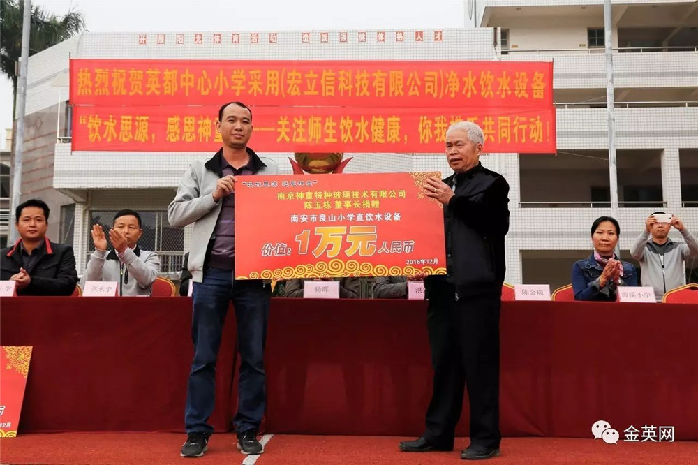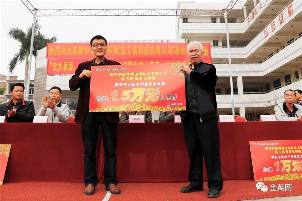 2016年10月,英都鎮中心小學書記洪新江老師參觀了其他高等級學校的飲水設備后心心念念想給全鎮的各所小學配上高性能飲水機,但受限于學校沒有財力支持,每次都只能望而興嘆!魯米星董事長陳玉棟先生獲悉情況后,通過調查得知廣東宏立信凈水器在泉州有良好的市場口碑和信譽,溝通后立刻委派南安市廣東宏立信凈水器總經銷商銷售經理陳麗萍女士到學校了解情況,隨后陳總果斷拿出10萬元給全鎮7所完全小學配上高性能飲水機,從根本上解決了小學生亂買飲料亂喝飲料的重大問題!校園飲水衛生問題也引起了南安市人大主席的重視,指示各學校要想辦法落實中小學生飲水衛生工程。