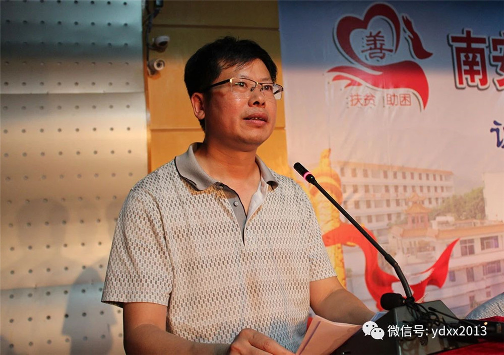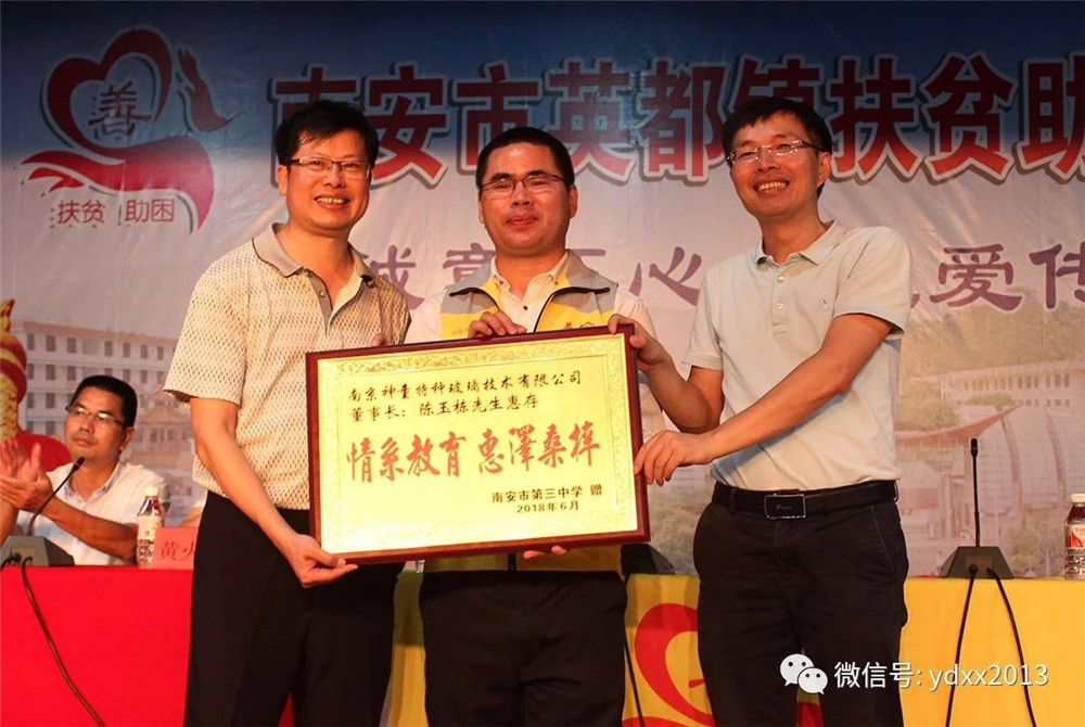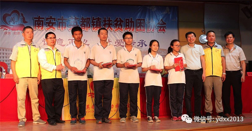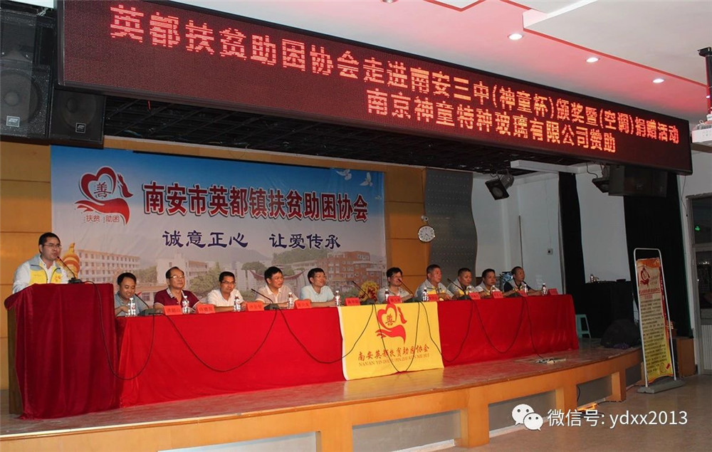 英都鎮扶貧助困協會會長洪梅生首先致詞,他說,今天的頒獎儀式是協會常務副會長、南京神童特種玻璃技術有限公司董事長陳玉棟慷慨捐資獨家贊助南安三中初中部和英都中學五年計劃“神童獎杯和獎學金”。他向首批獲得神童獎杯和獎學金的南安三中15位同學表示祝賀。