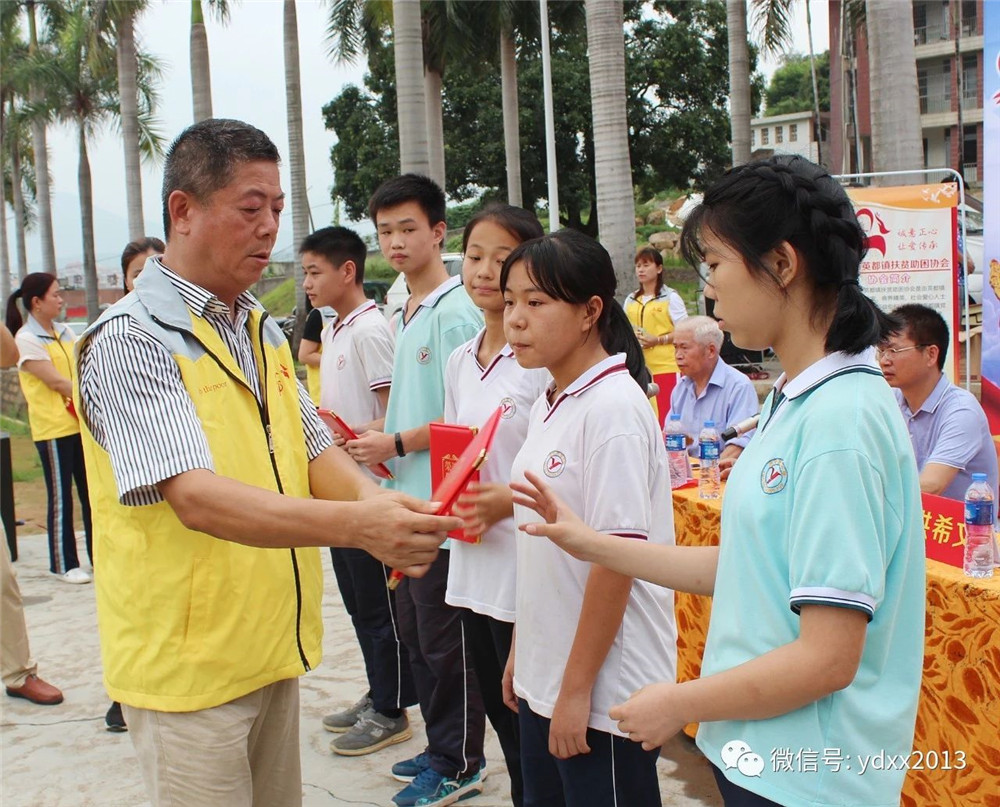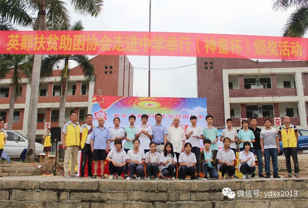 2018年6月5日下午,英都鎮(zhèn)扶貧助困協(xié)會走進英都中學,隆重舉行神童杯獎學金頒獎儀式。英都中學校長洪金聰、英都中學關(guān)工委名譽主任洪希文、英都鎮(zhèn)扶貧助困協(xié)會會長洪梅生、陳金瑞(陳玉棟父親)、英都中學全體學生以及扶貧助困協(xié)會部分理事成員出席頒獎儀式。